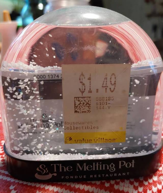 The Melting Pot is a popular restaurant franchise that specializes in fondue dishes. That gift card will allow the thrifter to feast while likely spending little more than what they purchased the snow globe for.