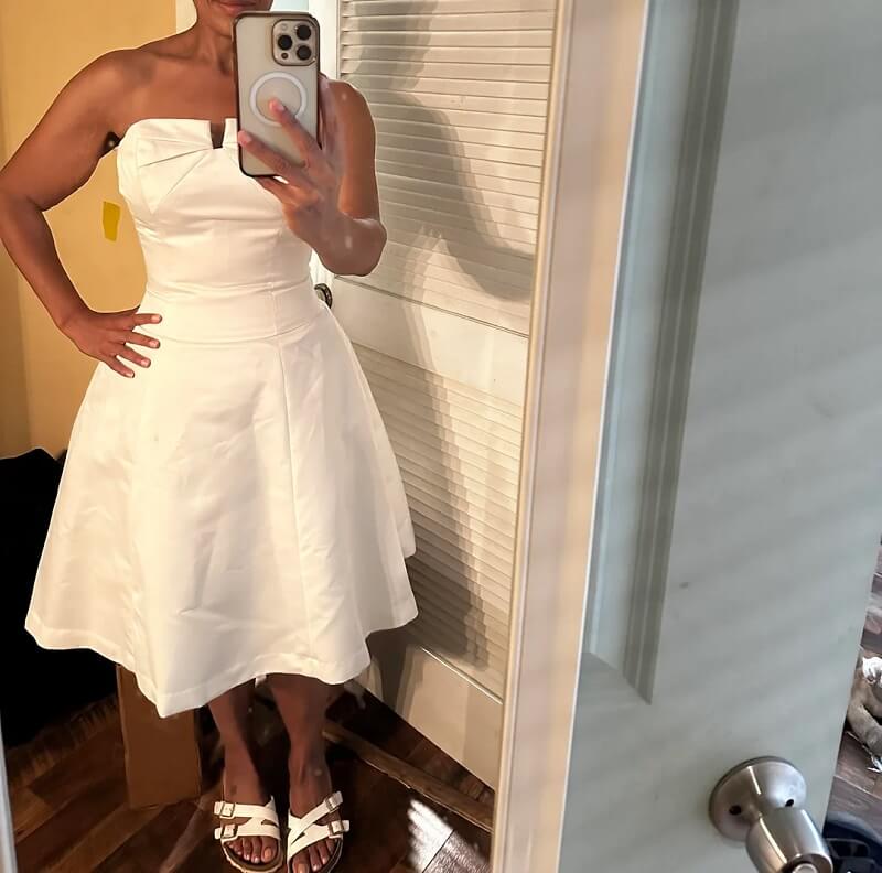 A Redditor shared their amazing find of a virtually flawless white dress in r/ThriftStoreHauls. The post shows several photos of the user wearing a lovely white dress, including a couple of close-up shots of the dress details. The tea-length dress features pleating on the front and buttons up the zipper in the back.