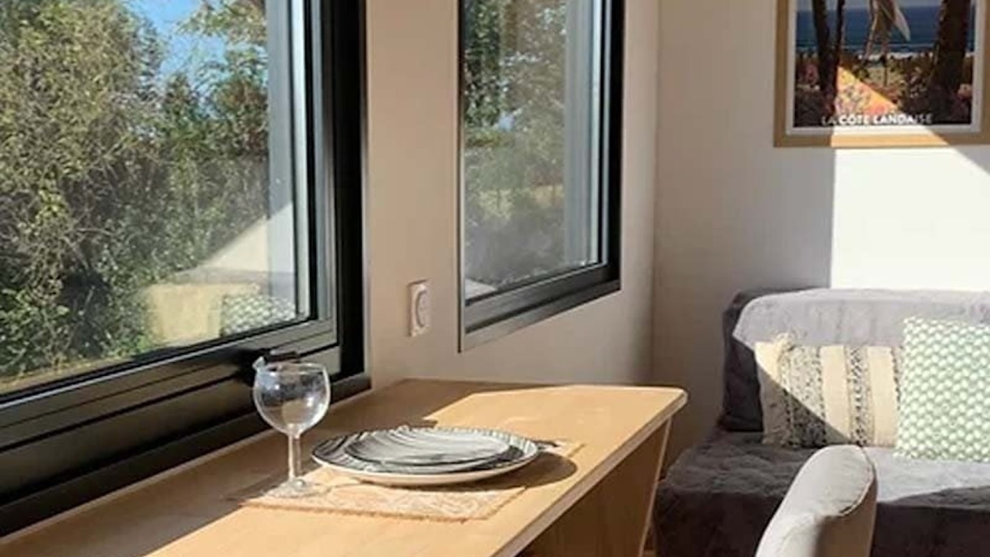 What makes it extra special is that the tiny home is on wheels, meaning the couple can take their house on the road and set up in the many picturesque locations provided by the French countryside. That said, the location they keep it in for the most part — nestled among trees and flanked by a sauna pod and a hot tub — isn't so bad, either.