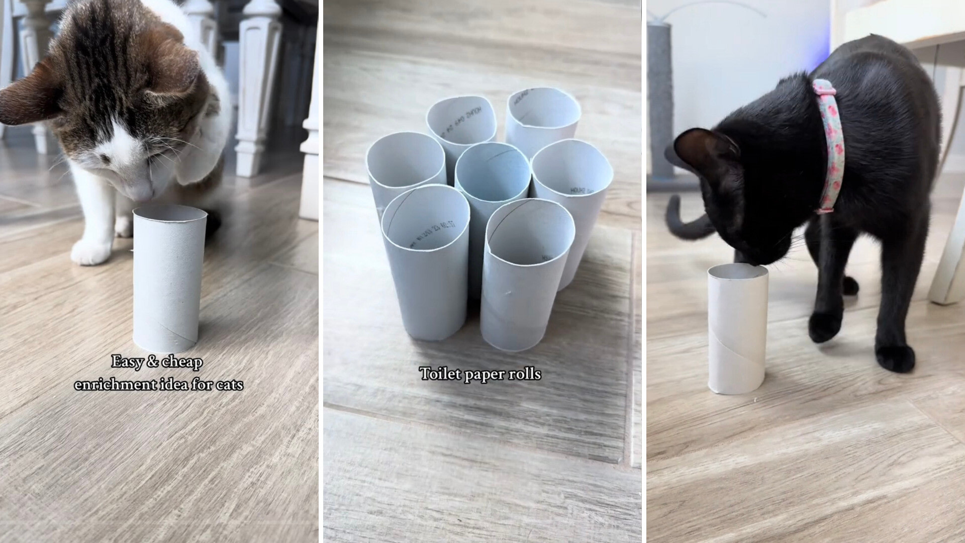 Joey and Koda's human posted a TikTok video on the Pet Crew account (@petcrew) that showed how they propped up empty toilet paper rolls on the ground and hid treats at the bottom for their cats to discover. The simple toy engaged the cats and offered a little reward for their curiosity.