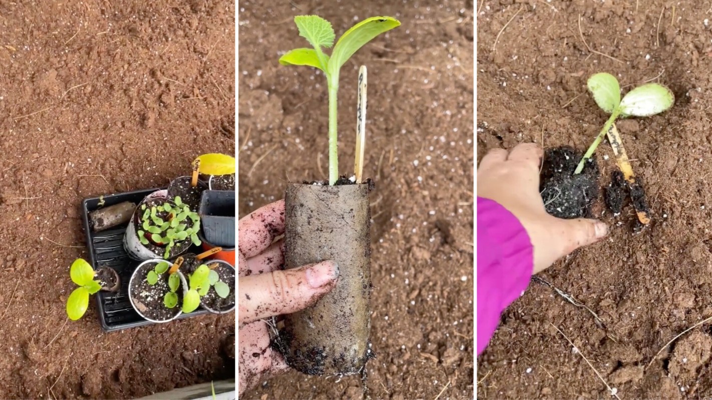 "I use the toilet paper rolls because the roots can grow through and they can grow under, but it also peels off," the gardener explained before planting her starters into the ground — plus, "it holds together nicely."