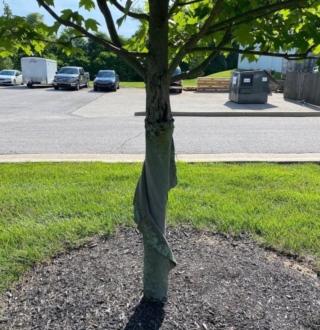 "I am assuming this was to protect the tree when it was young, but it seems to be preventing the trunk from growing any wider," wrote the employee. "Should we remove the fabric?"
