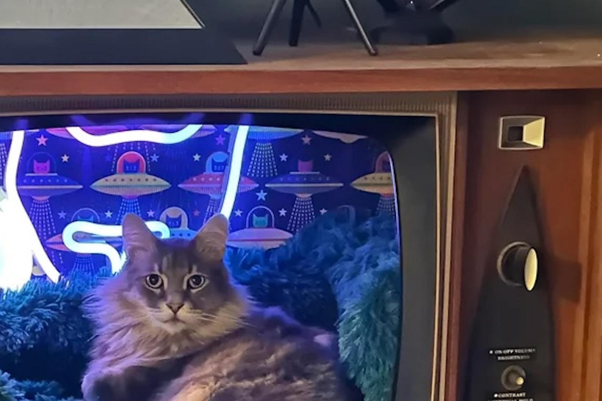 The poster shared pictures of the cat house in the r/Mid_Century subreddit. They showed their two cats taking turns lying in the bed area, which initially housed the TV and is now decorated with wallpaper and neon lights.