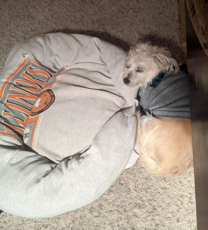 The pictures show that the OP filled an old sweatshirt with stuffing, using the stuffed sleeves as the perimeter of the bed. Their rescue dog looks relaxed and is enjoying their homemade bed.