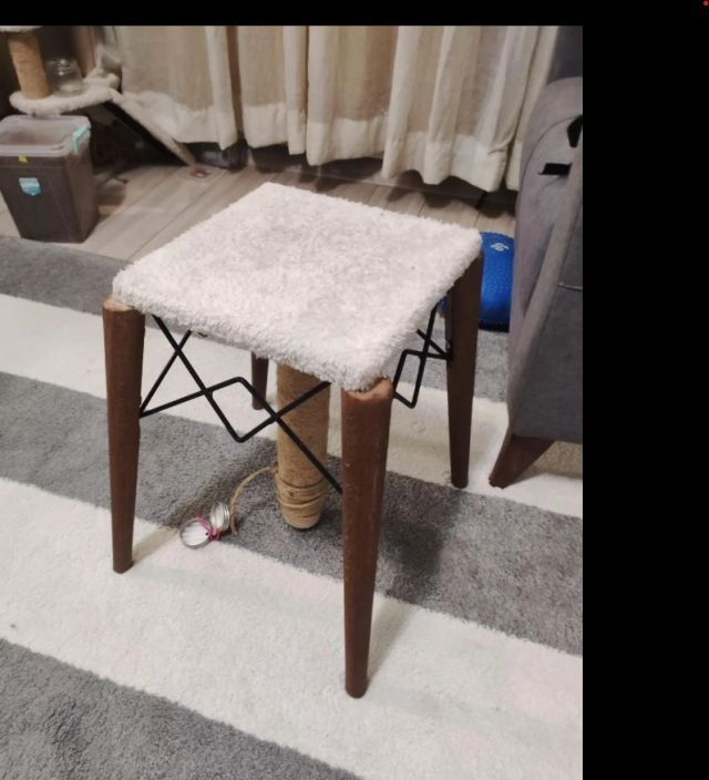 The attached images show a "before" picture of the older dining chair, and then "after" pictures of cats enjoying the new stool and cat bed.
