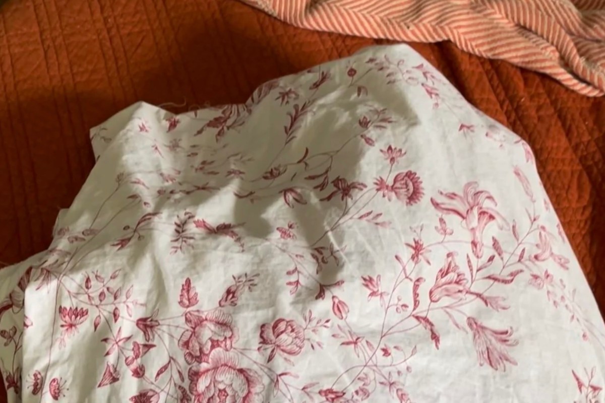"$2 thrift IKEA duvet cover into a dress" reads the title of the post featuring self-portraits of the creator wearing an off-the-shoulder dress — and pictures of the bed covering she used to construct the sweet floral number.