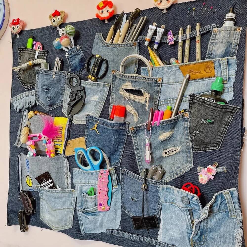 The original poster shared a pic of their ingenious creation that utilized old jeans to make simple and effective compartments for their craft materials. Not only did they upcycle the jeans' pockets, but they also used different parts of the garments to create compartments of various shapes and sizes.