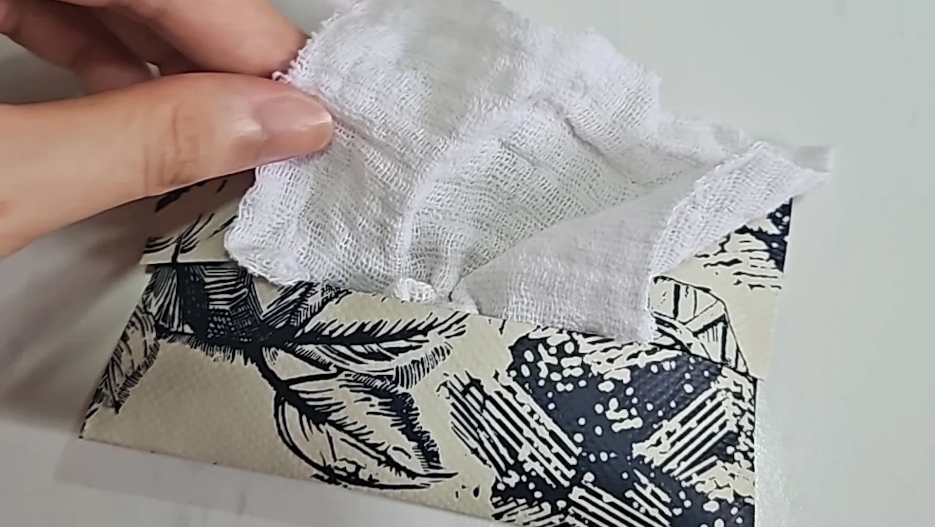 The photos show the bag (which has a really nice design) repurposed into a functional napkin dispenser. The photos show how the creator cleverly folded the bag to create a neat slot for pulling out tissues. It's a simple, no-cost DIY that turns an old bag just lying around into something both cute and practical.