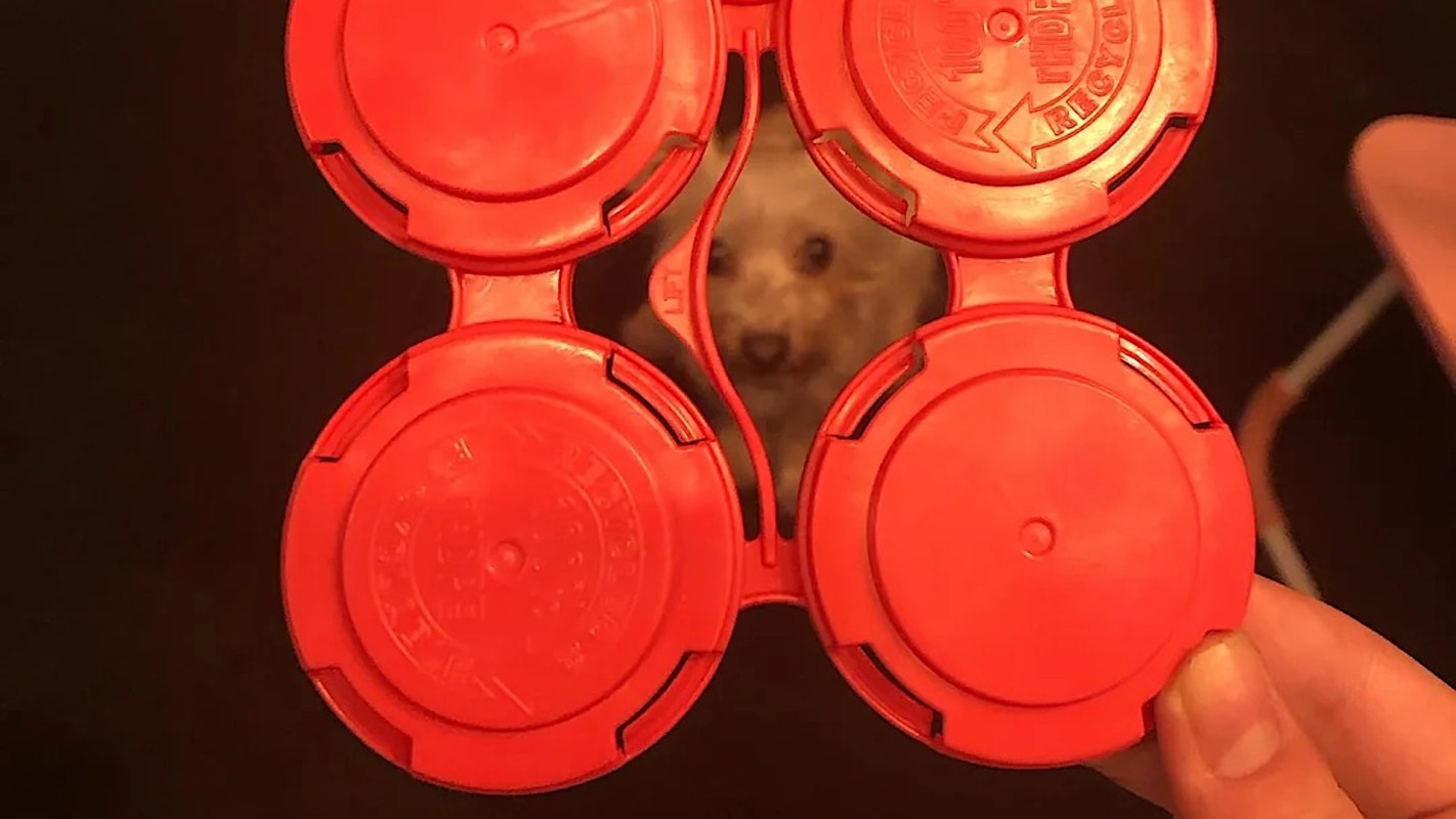 They included a photo of a four-pack holder, and if you look closely, their dog makes a cameo in the center of the plastic tops.