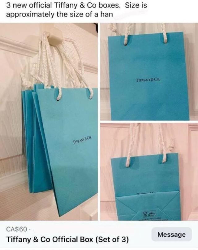 The original poster shared a screenshot of three Tiffany & Co. bags being sold for 60 Canadian dollars in the r/Anticonsumption subreddit.