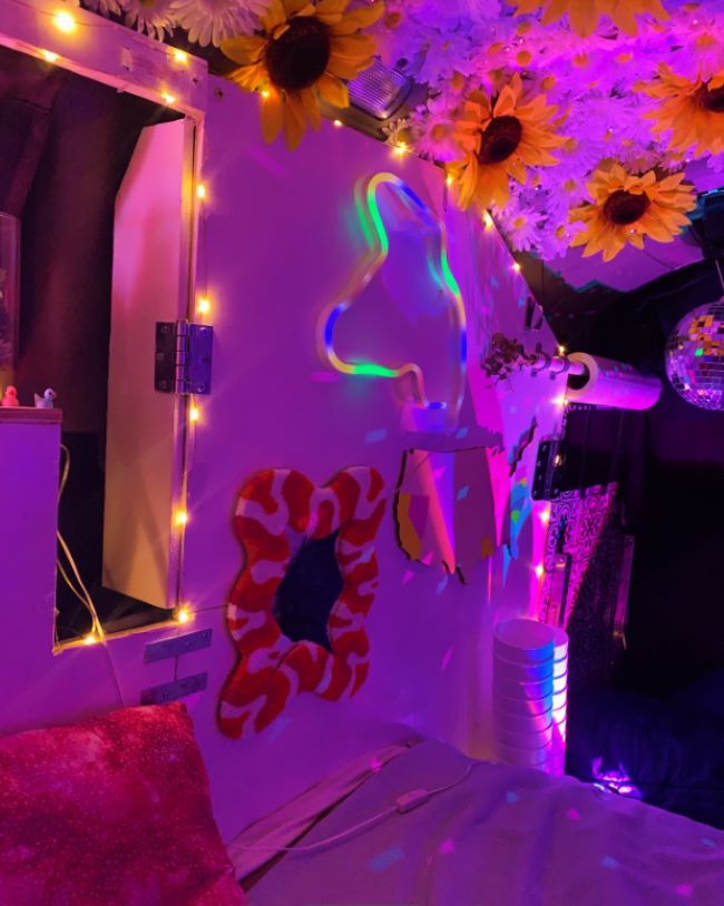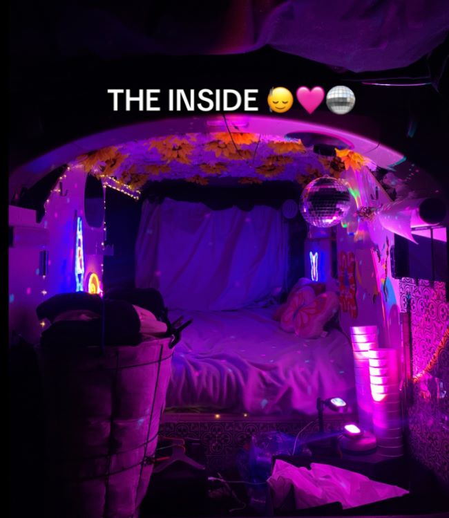 Courtney Monaé (@hai_itscourtney) shared a series of photos, contrasting the unassuming plain van exterior with its decorated interior. Inside, a disco ball, neon lights, cozy bed, and wall-mounted shelves set a warm and welcoming atmosphere — one that you'd never guess belonged to a regular minivan.