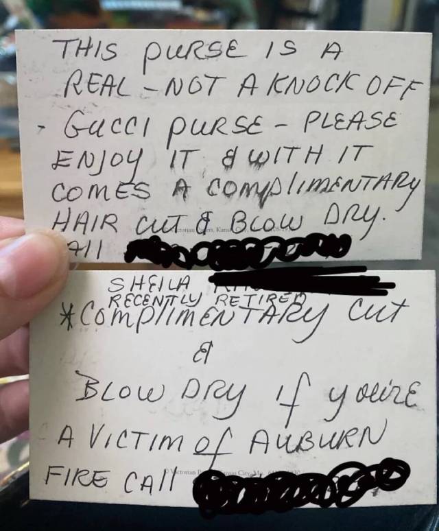 After looking inside the bag, the shopper also found notecards stating: "This purse is a real — not a knockoff Gucci purse. Please enjoy it, and with it comes a complimentary hair cut and blow dry."