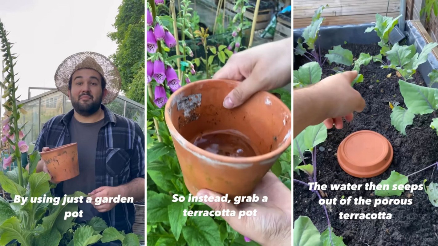 "By using this ancient technique, the water then seeps out of the porous terra-cotta, going straight to the plants' roots, giving them a constant supply of water — and very little work for you," Joe explains in the video.