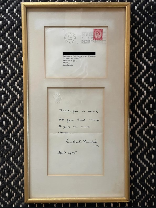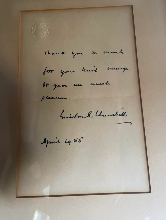 The post included a photo of the framed note, featuring an envelope dated April 1955 along with a message from Churchill himself.