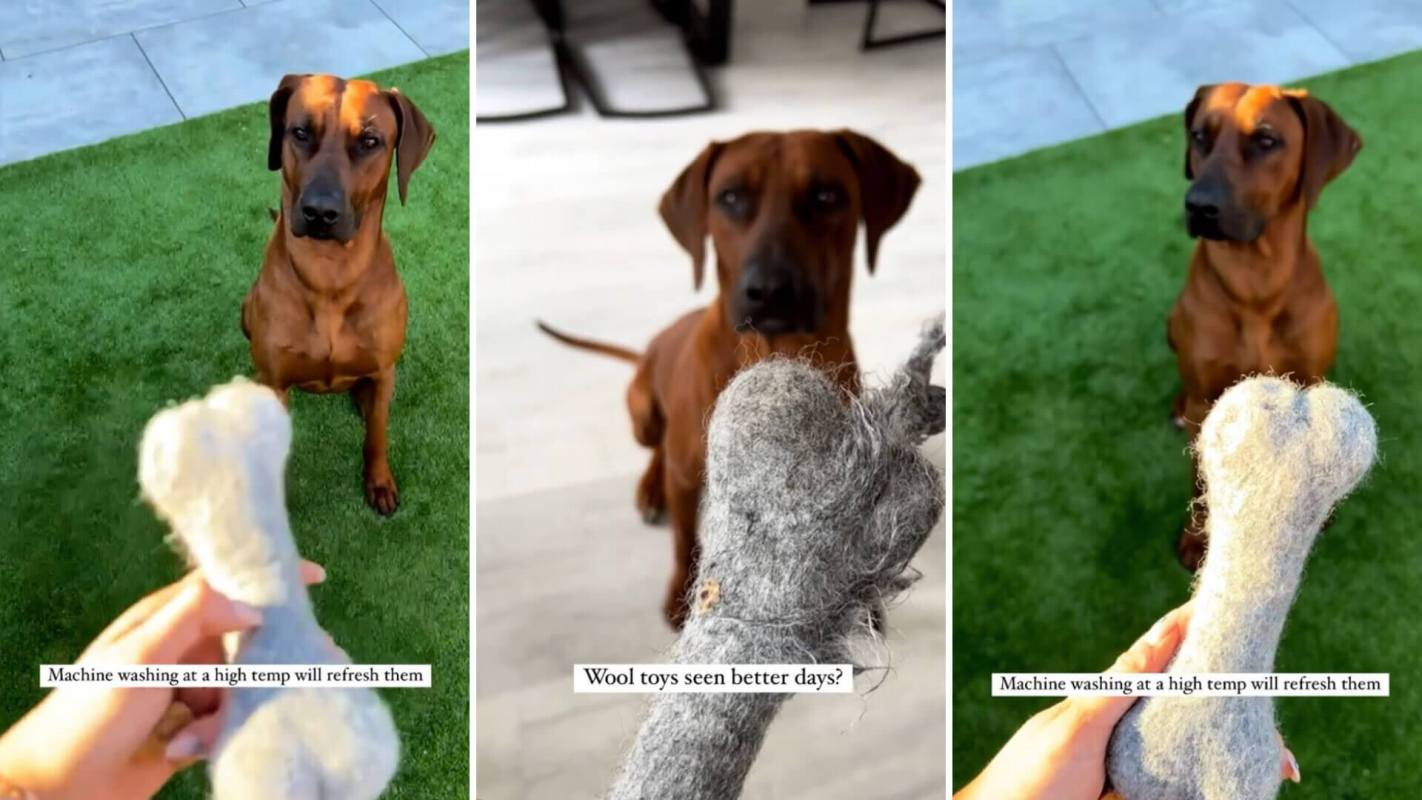 The video shows before and after shots of a wool dog bone. In the first shot, the bone is frayed and squashed, but in the second, it's once again fluffy and ready to be played with.