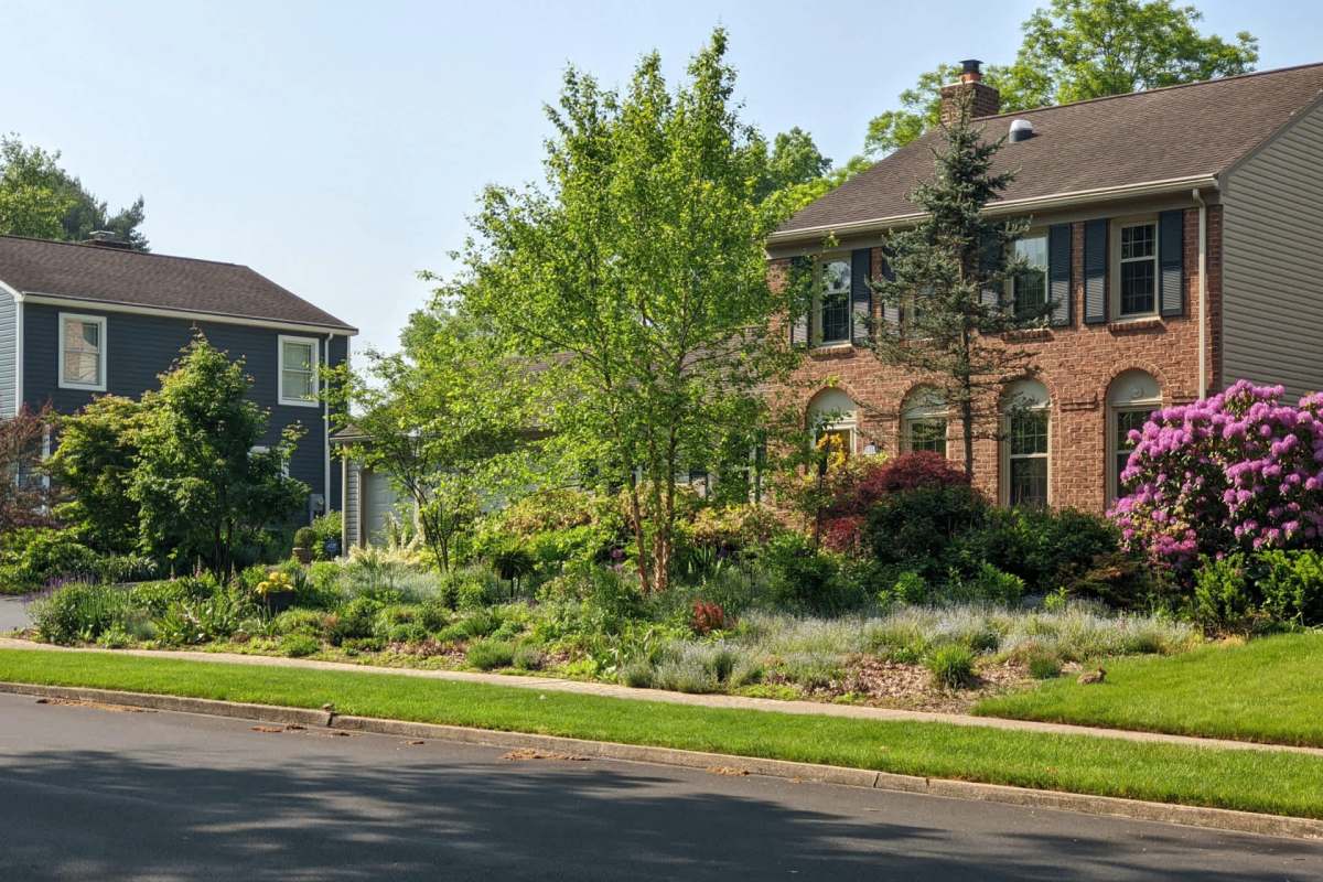 A Redditor in Pennsylvania posted their admiration for their neighbor's green thumb. The shared photo showcased a lush front lawn that used a small space to develop biodiverse plants, including a tree, white and purple flowers, various ground cover, and more.