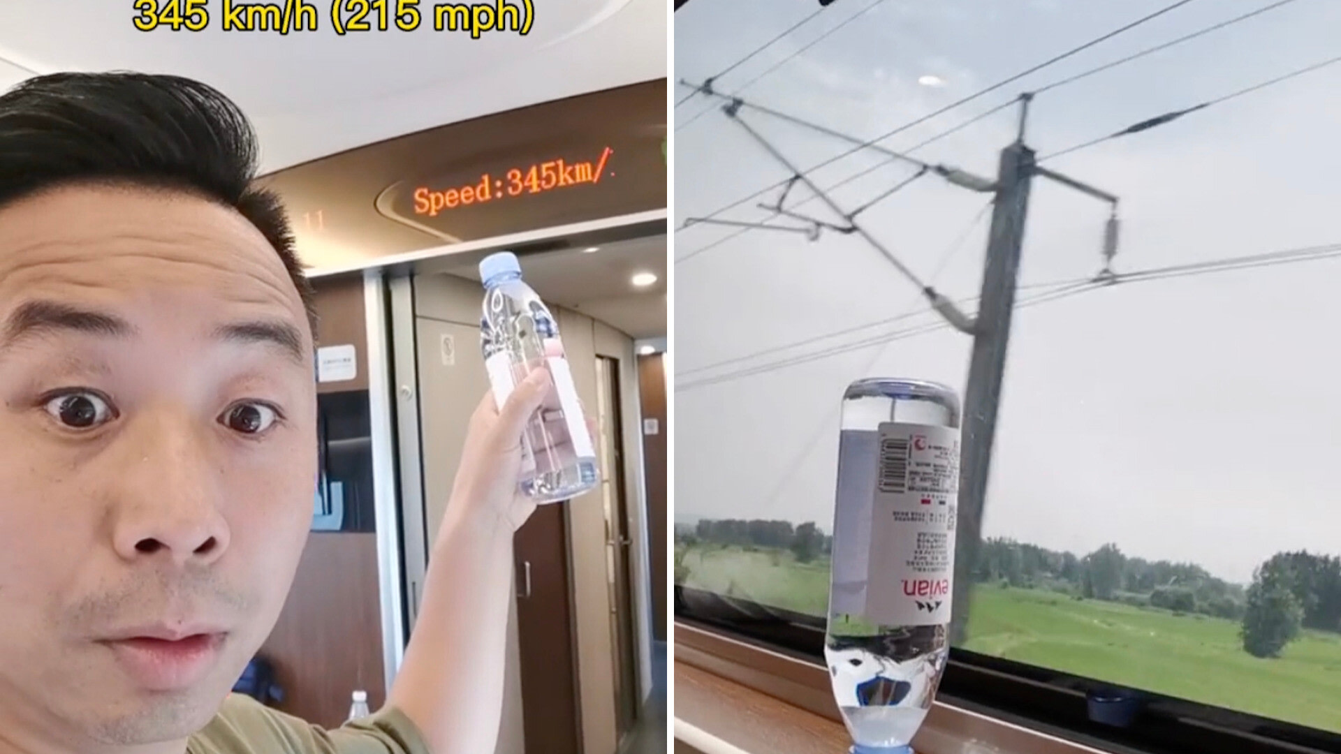 Ren first shows that the train is hurtling down the tracks at a speed of 215 miles per hour. Then, he takes a water bottle and balances it upside down on one of the window ledges. The bottle barely moves.