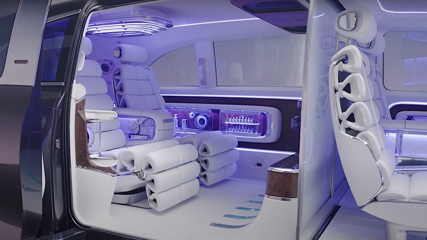 The opulent interior brings retro-modern, private-lounge vibes in white leather, pore wood, and glass. It is loaded with features, including customizable ambient light to create the desired mood, two fully reclining armchairs, and 45 speakers. A 65-inch TV that rolls out of the floor through glass slats can provide entertainment and can also go into fireplace mode to create a cozy ambience.