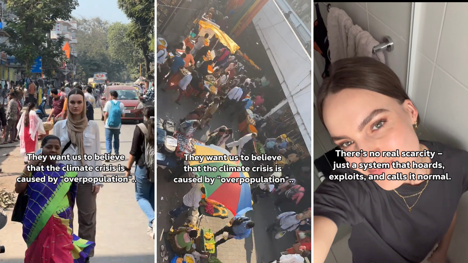 "They want us to believe that the climate crisis is caused by 'overpopulation,'" the video's text reads. "But the truth is..we have enough resources for everyone!"