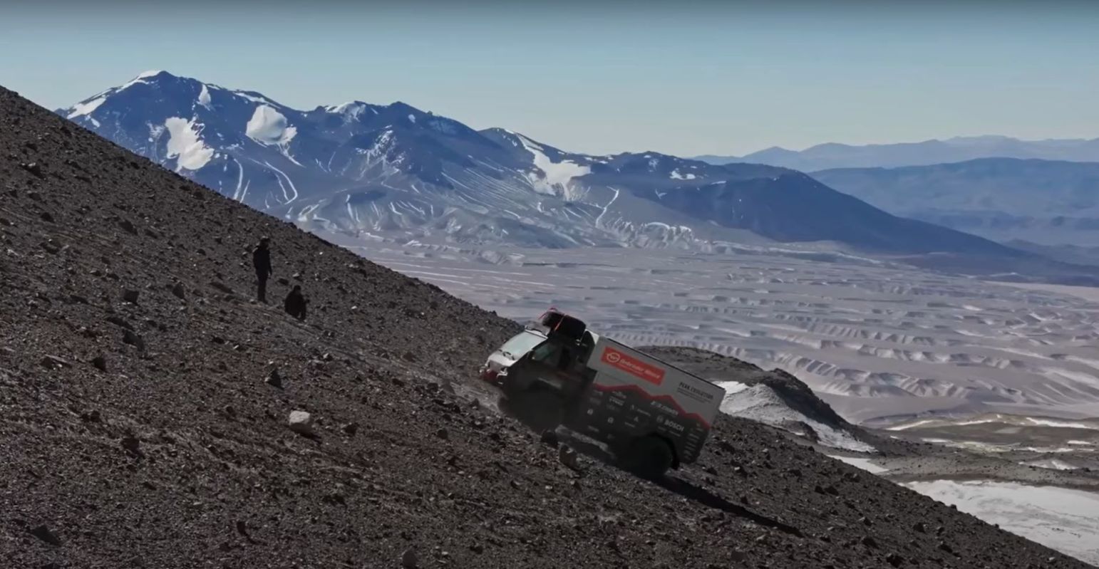 Swiss team Peak Evolution guided the truck, which is charged by four rooftop solar panels and 16 more on the ground, to an altitude of 3,400 meters (11,155 feet) up the world's highest volcano, setting a new record for the highest altitude reached by an EV.