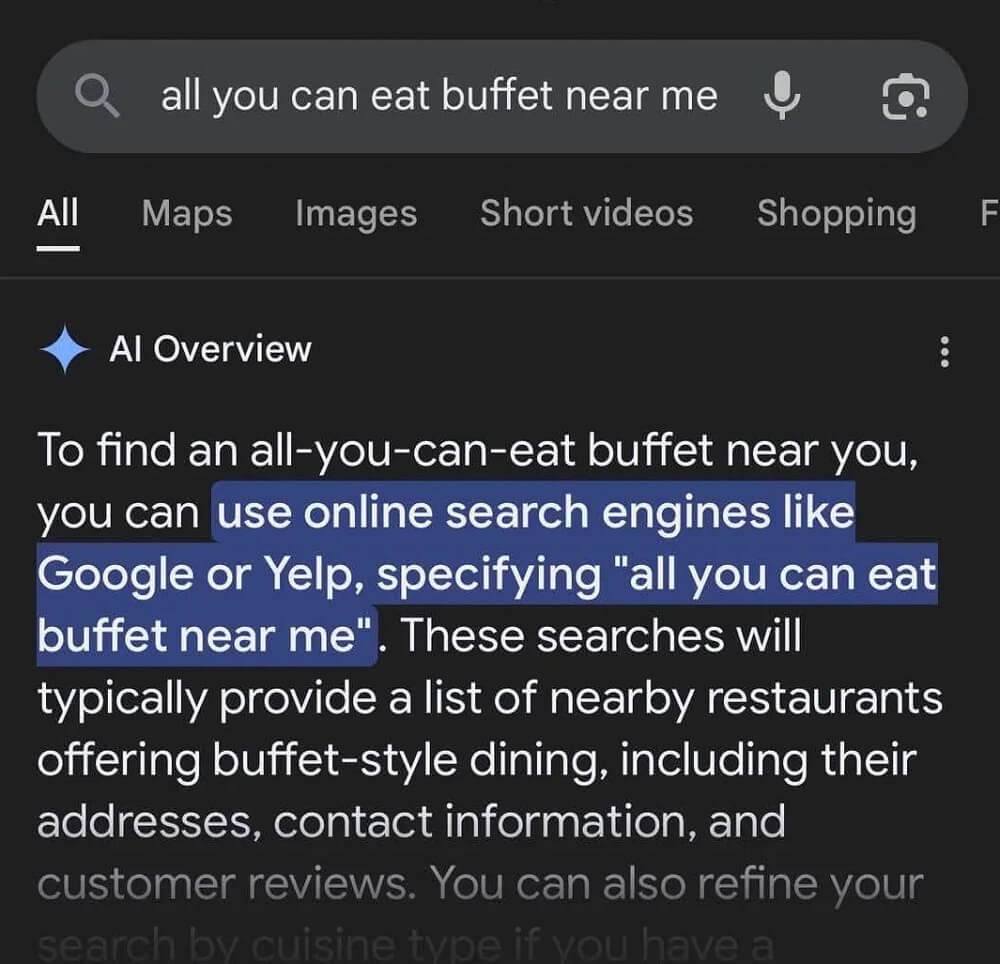 Instead of giving them a list of nearby buffet spots, the AI Overview gave the Redditor this suggestion: "To find an all-you-can-eat buffet near you, you can use online search engines like Google or Yelp, specifying 'all you can eat buffet near me.'"