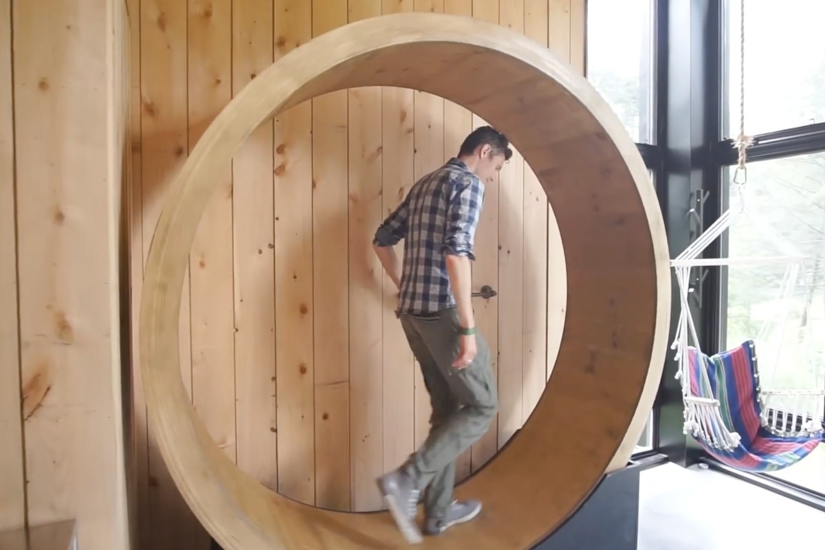 That's because the occupants in these unique dwellings can become part of their own power source, supplementing the cabins' solar panels by walking or running on a giant wheel in each one. It's all shown in a YouTube video shared by Exploring Alternatives — and in coverage about the property from Unofficial Networks.