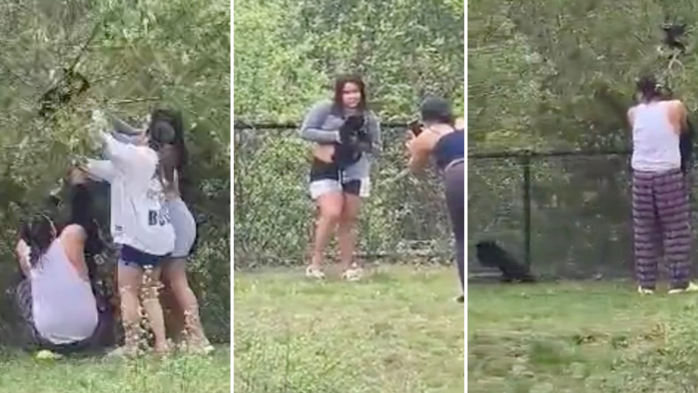 After grabbing one of the bears, a woman shrieks excitedly and poses for pictures holding the cub, while the others try to retrieve the second bear.