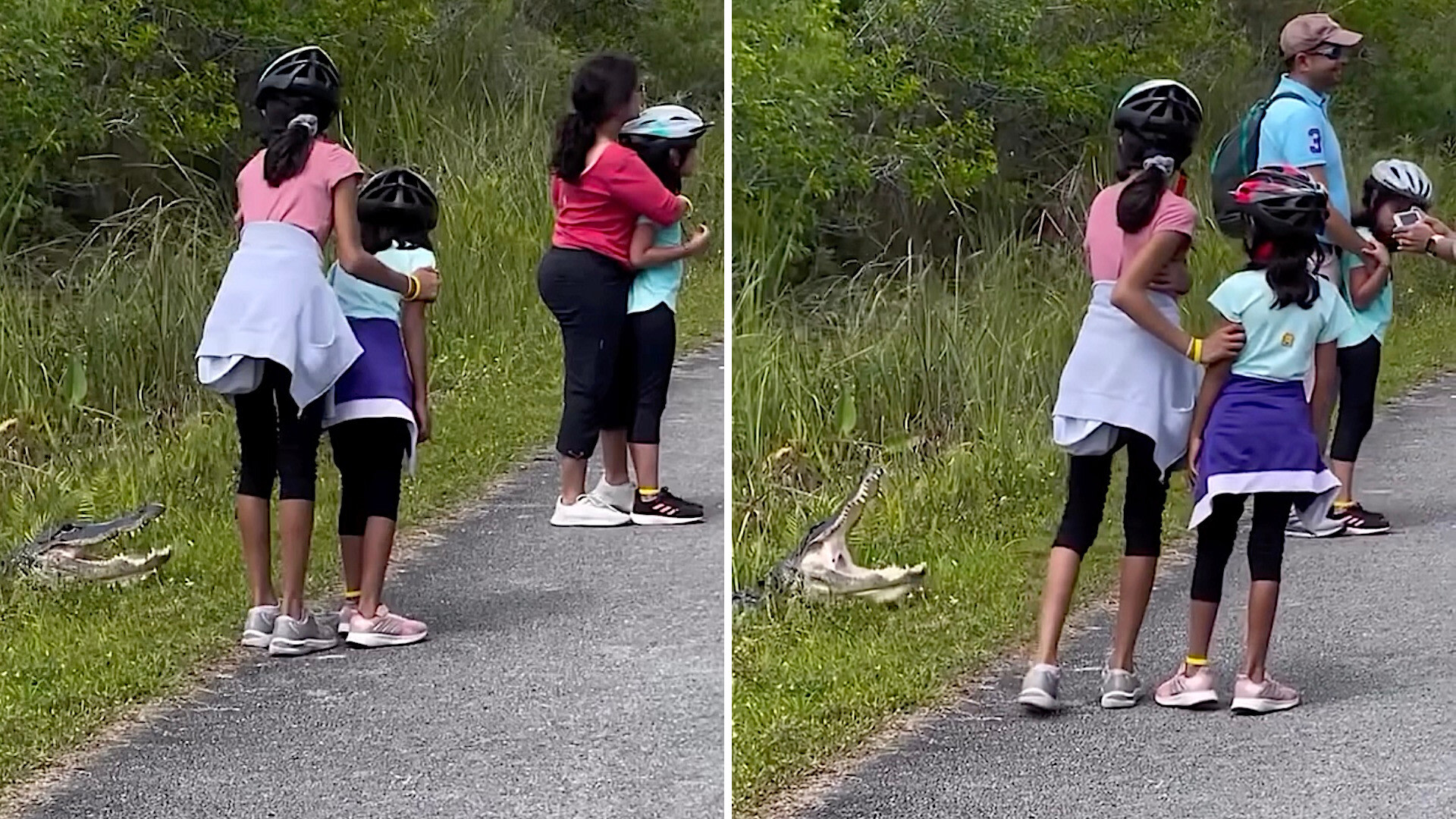 The video shows a family getting their photo taken on the side of the road with an open-mouthed gator in the grass less than a foot away. One of the children, clearly frightened, is reluctantly pulled into the shot by her mother.