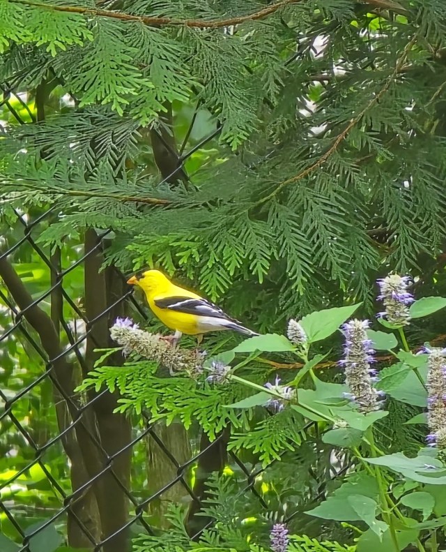 In the r/NativePlantGardening subreddit, a gardener shared photos of beautiful goldfinches perched in their anise hyssop flowers, which they said also attract bees.