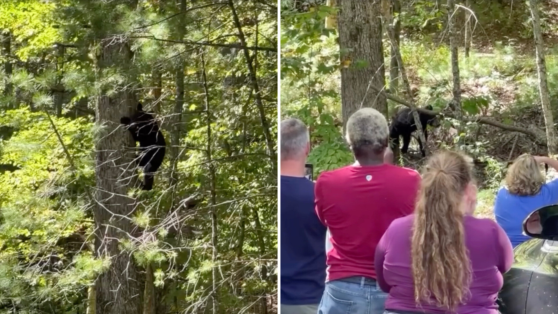 In the clip, multiple visitors at Great Smoky Mountains National Park moved close to what appears to be a black bear cub to take pictures and get a good look as the cub shimmied down a tree and proceeded to stare at the crowd.