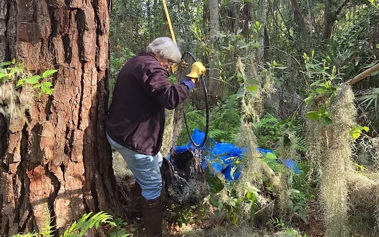 A local tree service company received an urgent call from Florida's Fish and Wildlife Conservation Commission regarding two eaglets dangling from a fishing line 90 feet up in a massive pine tree. Boyd Deley, the owner of Odom's Beaches Tree Service, used a crane to rescue the birds.