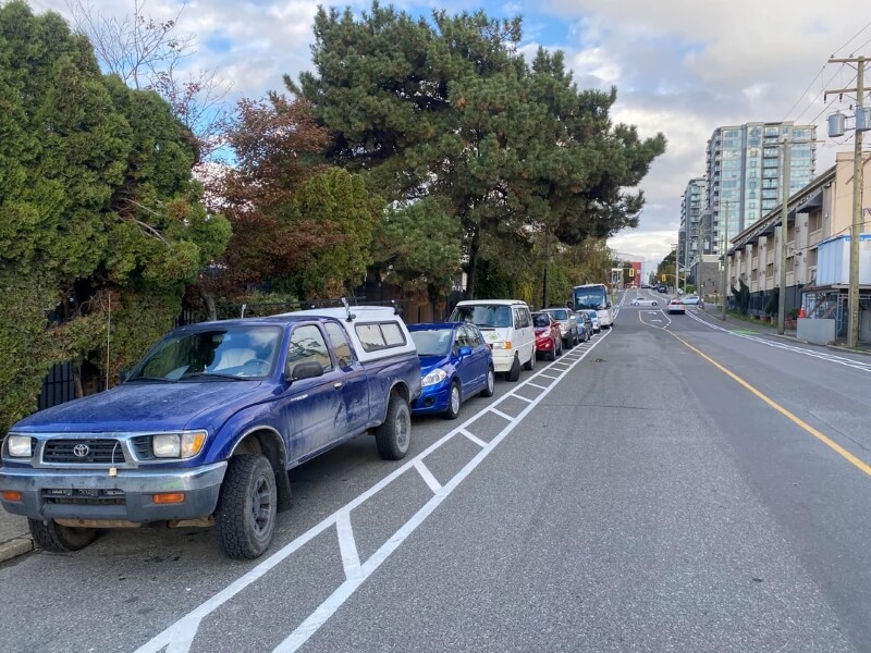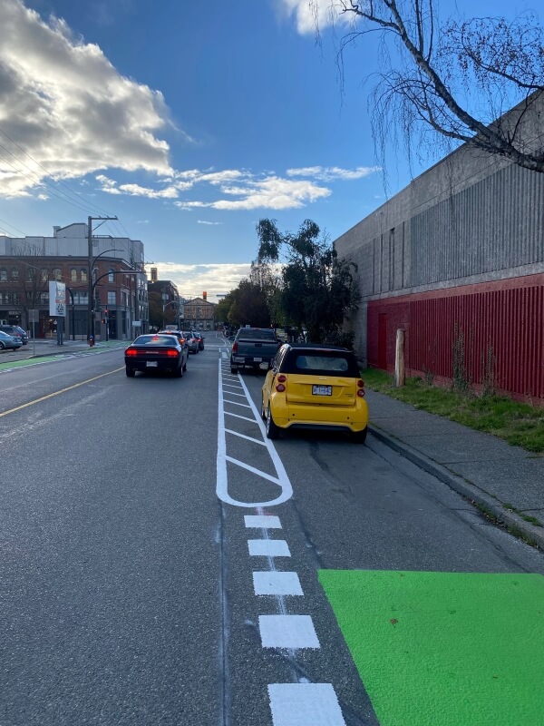 A Redditor reposted images taken by a bystander in Victoria, British Columbia. The photos show several cars parked inside the brand-new dedicated bike lane.