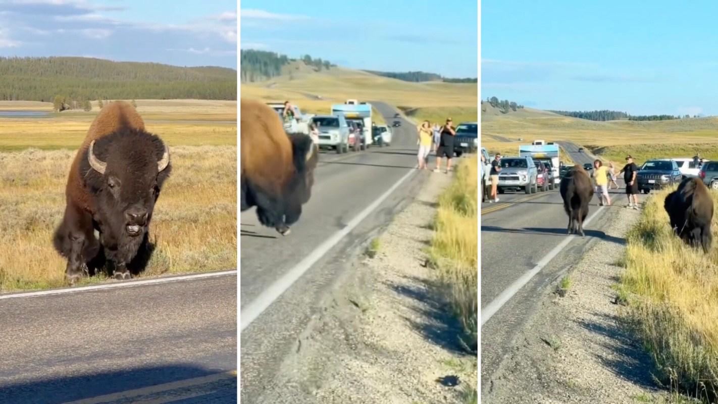 The video, which seems to have been captured safely from inside a car, starts with a shot of a bison standing at the opposite side of a road in Yellowstone. Two others soon join it — and so does a crowd of stopped cars with people loitering outside them to watch.