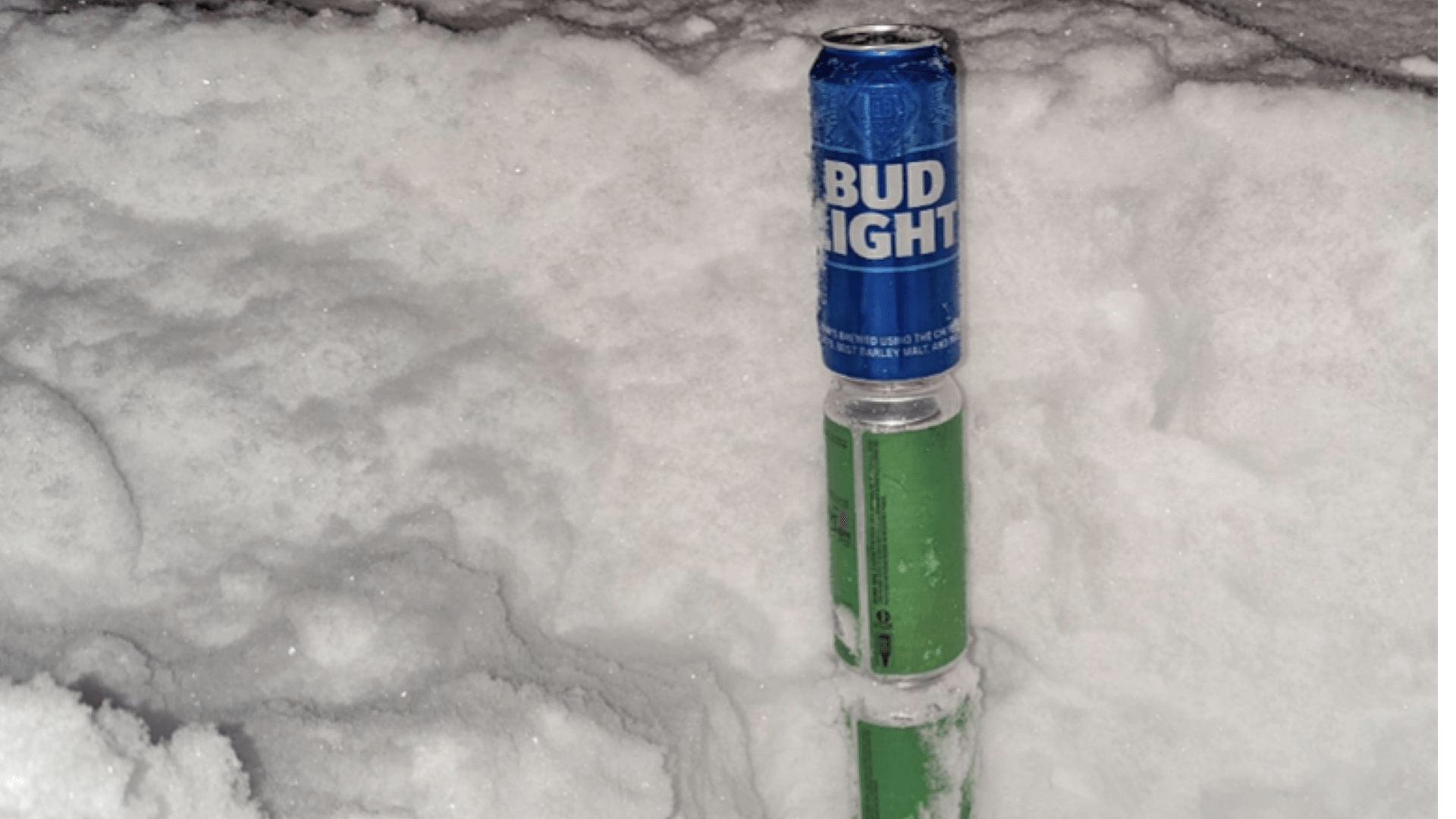 A Redditor from South Dakota shared a photo of a recent snowfall that measured three Bud Light tallboys high and counting.
