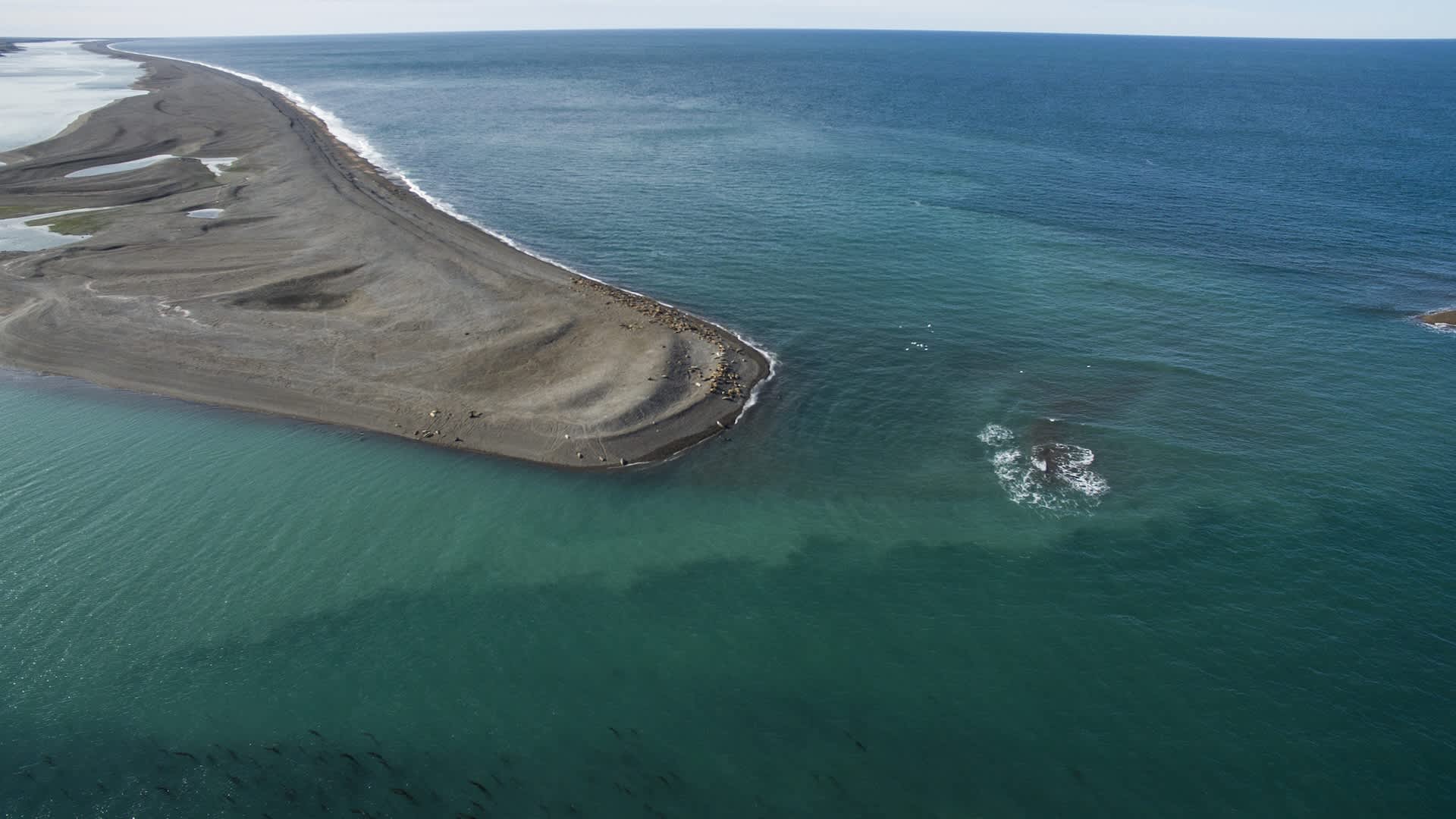 Aerial view of a sandy peninsula extending into a turquoise ocean.