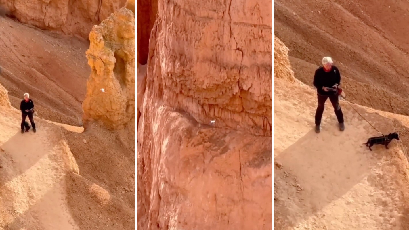 A parkgoer shared a video they took with the Tourons of National Parks Instagram account (@touronsofnationalparks). In the clip, a woman is flying a drone while managing a leashed dog at Bryce Canyon National Park in Utah. She is seen navigating the drone high up within the beautiful red canyons, occasionally stepping around her dog's leash or pulling it toward her.