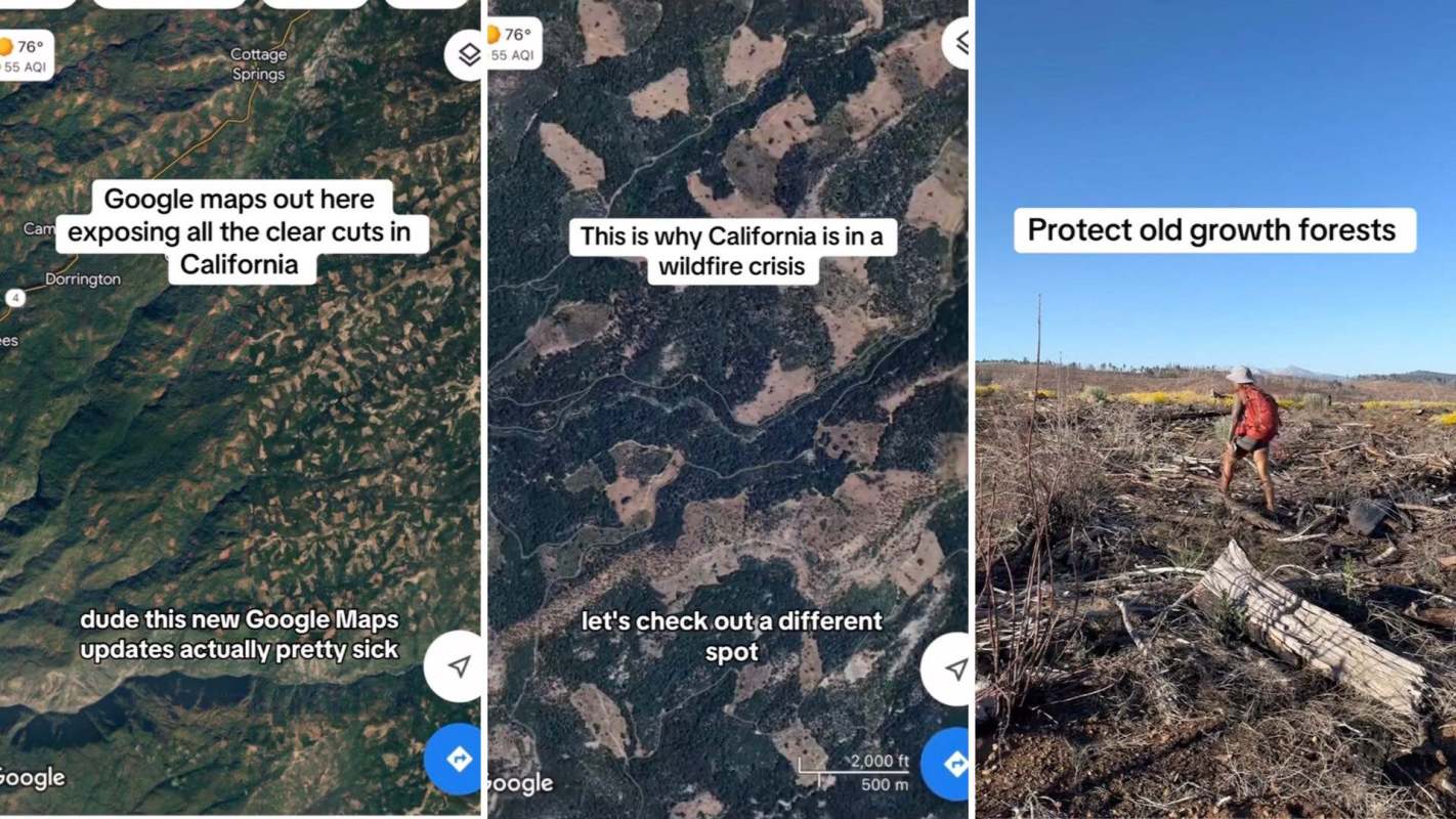 Conservationist TikToker Jessie Dickson (@sacramentofoodforest) shared screenshots from Google Earth that show vast swaths of old-growth forest in California have been taken over by corporate monoculture tree farms, which make wildfires even worse.