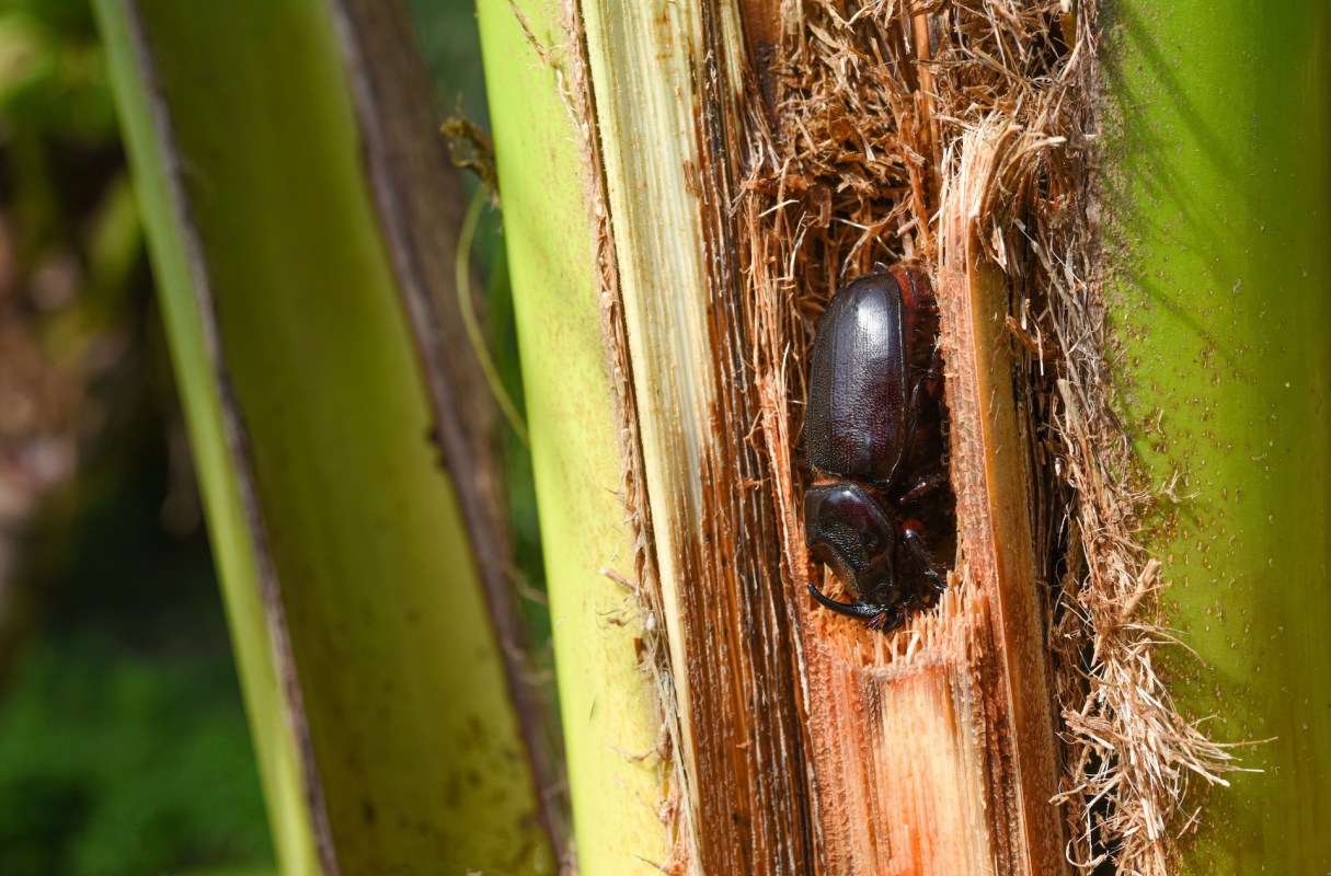 The beetles also damage taro, pandanus, banana trees, and more, making them vulnerable to disease or killing them.
