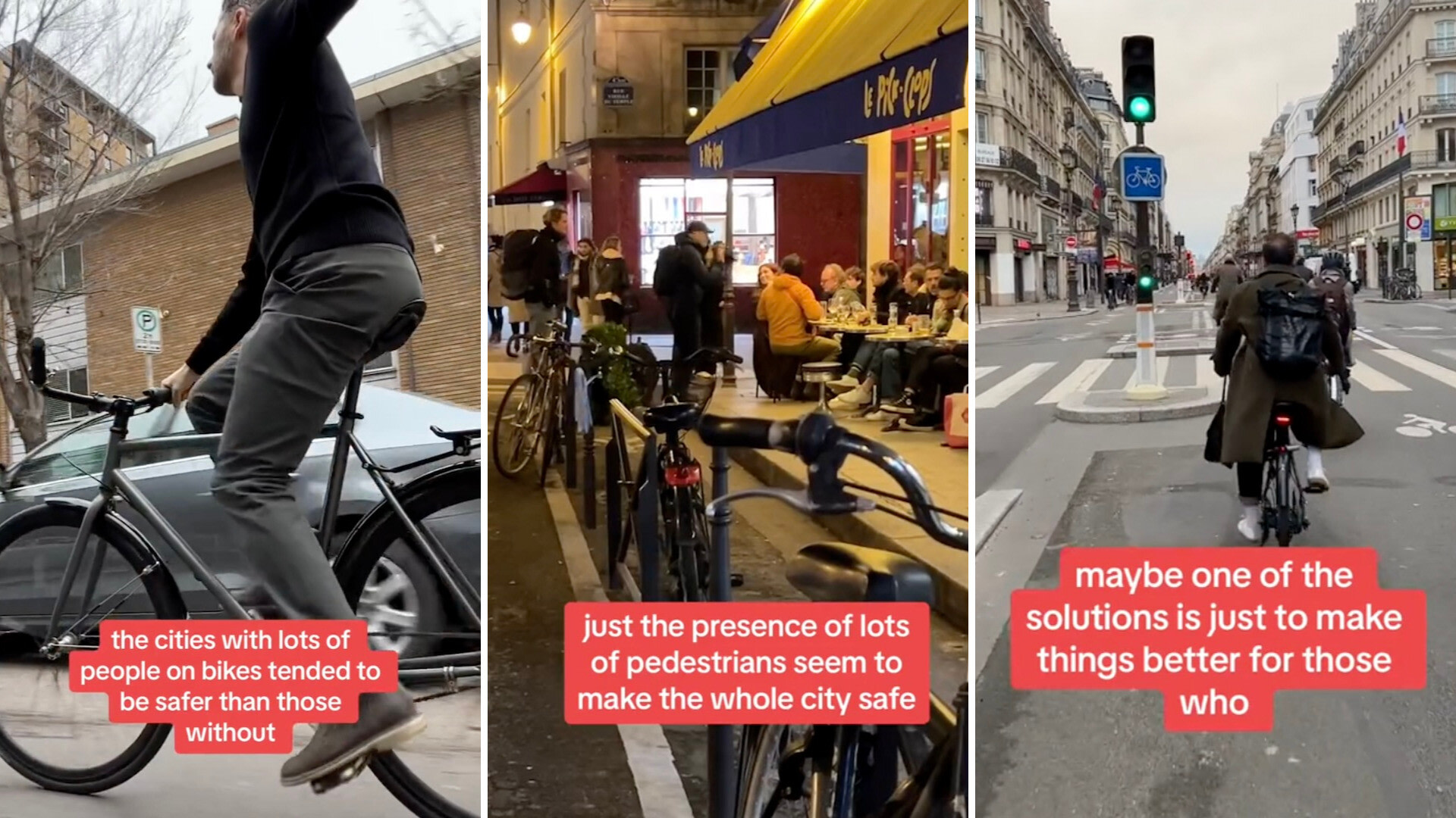At the end of the TikTok video, Tom suggests that, in order to make cities safer, officials should make things better for those who are traveling by foot or bike.