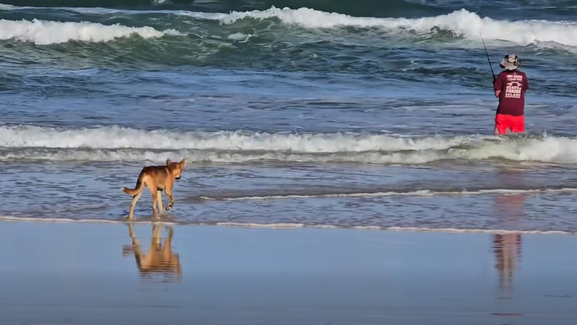 Dingoes should be naturally fearful of both humans and the ocean, they argued. The fisherman isn't doing anything to attract the dingo either, yet it is still very curious. By the end, it's more than merely interested, as its tail goes up high, signaling heightened alertness and excitement.