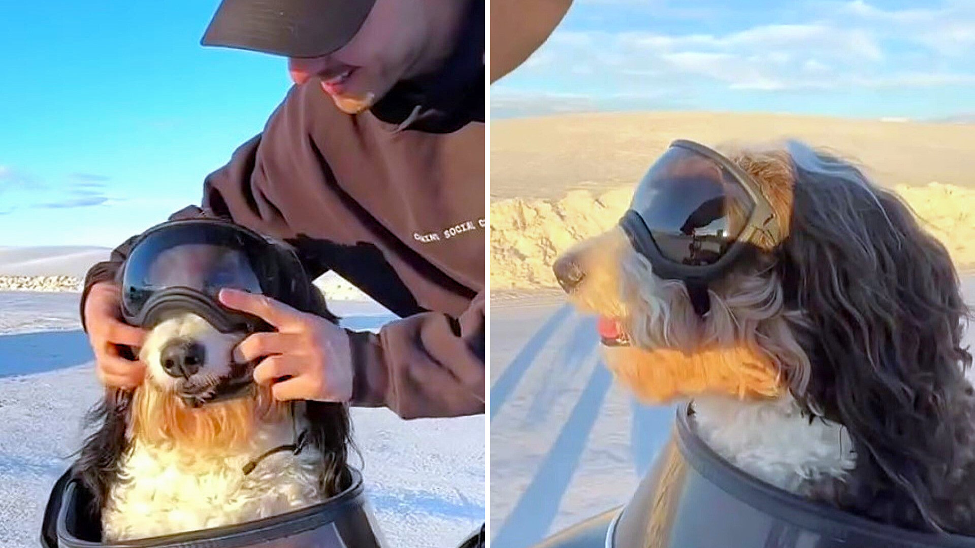 The dog dad even puts snow goggles on Benji as they ride around, looking like they're having a blast.