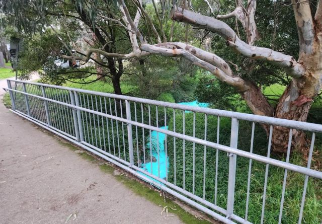 The trail user explained that the bright blue polluted water was in the Banyule drain next to a shared trail. Authorities sandbagged the creek in a few places downstream to address the issue.