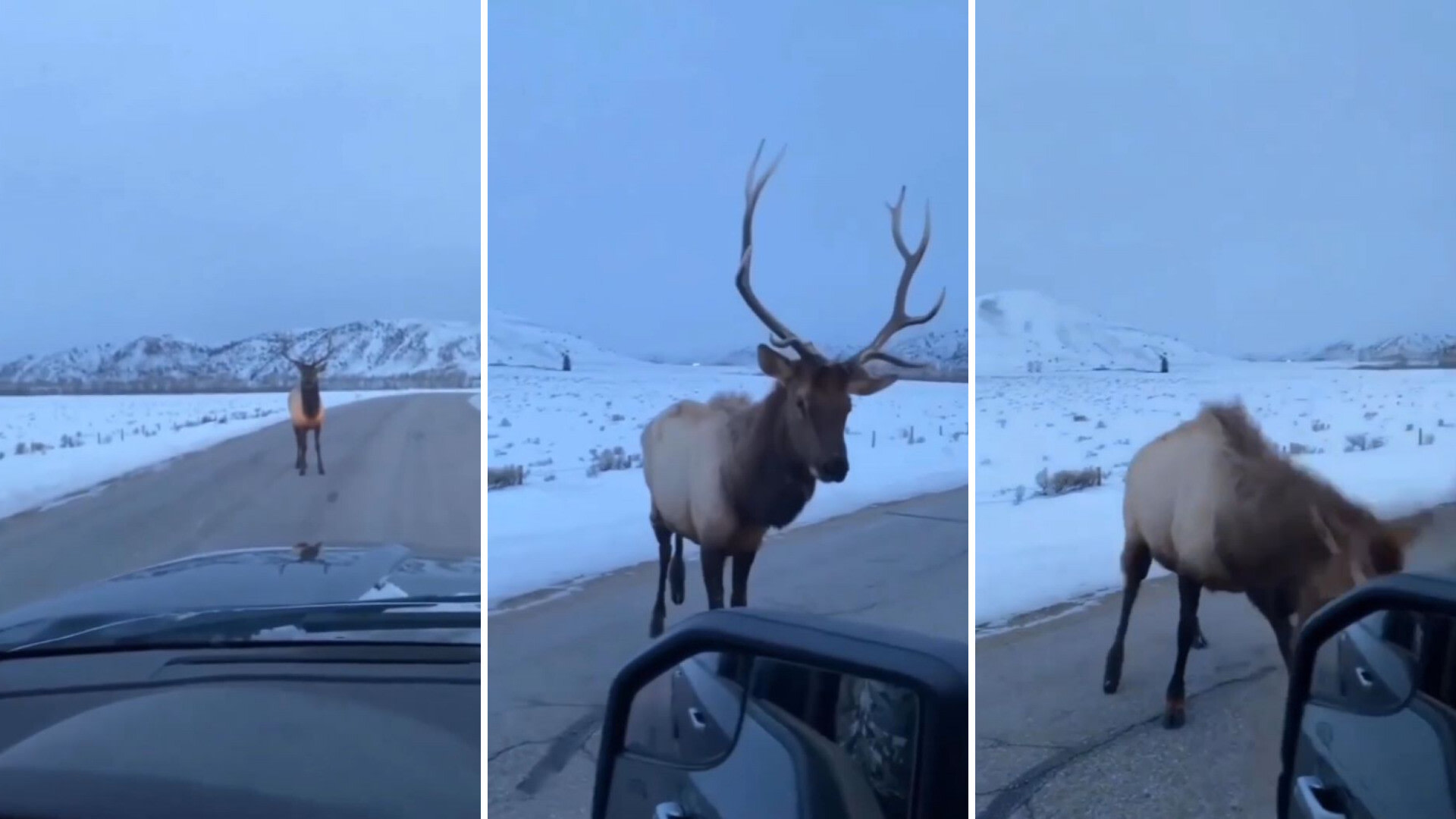 The elk slowly started stepping back, but the driver pulled up close for an uncomfortable staredown. But the elk stood its ground.