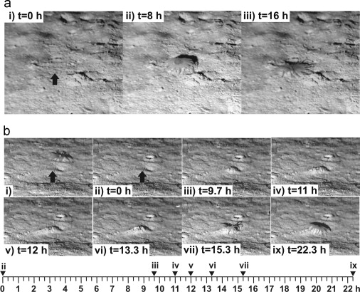 After disappearing from view, it started building a mound from under the sediment nearly 10 hours later. It did that for almost five hours until breaking through, and it took eight more hours to emerge and establish itself. It spent six days there before moving again.