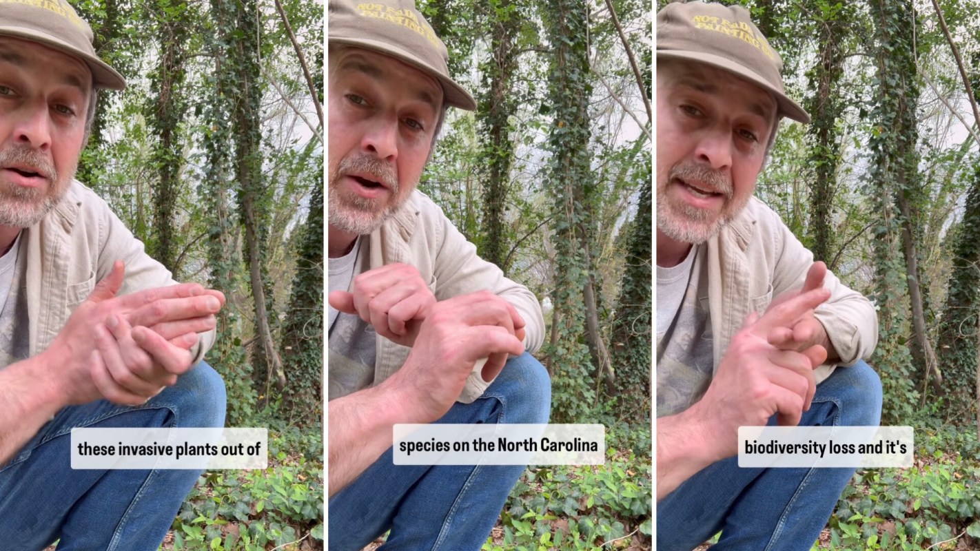 While crouching in front of an overgrown thicket of ivy vines, Tom Groves (@plants.are.people.too) urges North Carolina residents to stop planting English ivy and vinca (also known as periwinkle), two invasive species that have become out of control in the state.