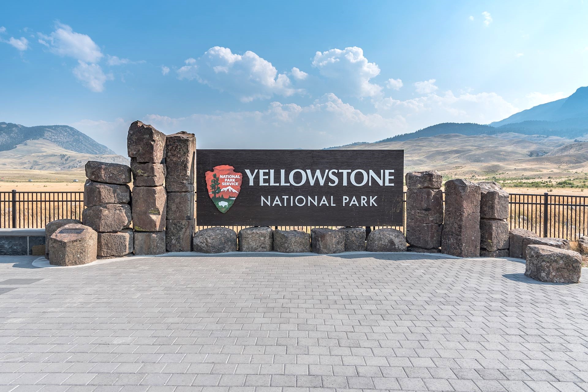 In the foreground, a placard with a bright red line tells visitors that pets are not allowed. The sign was between a no-smoking marker and one that stated, "As a courtesy to others, please silence your mobile device while enjoying Yellowstone's natural features."