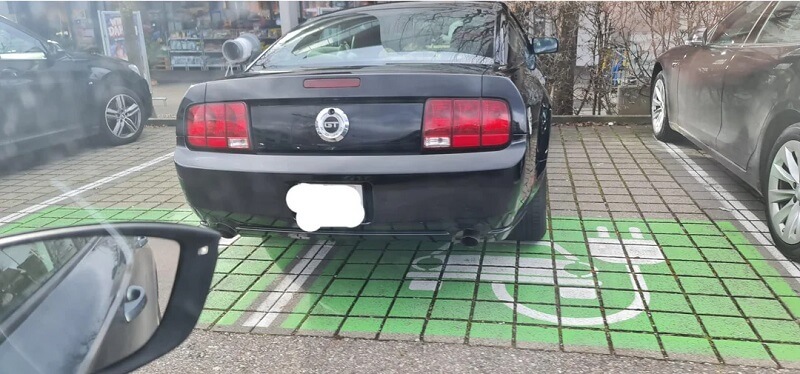 Someone else suggested: "Park behind them." The original poster responded: "Sadly, that would be considered as a 'coercion' here in Switzerland, which would leave me with a higher fine than what the driver of the Mustang would get."