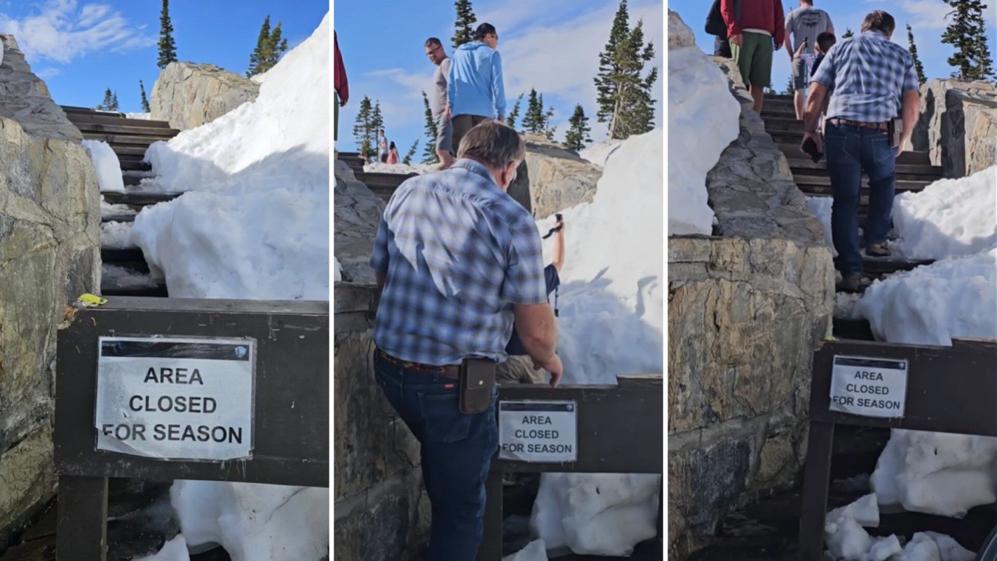 "This is Oberlin Bend just before Logan Pass at Glacier National Park yesterday, where virtually no one respected this sign," Amy said. She shared a video of several people moving past a sign that read "Area Closed for the Season" to hike up stairs partially covered in snow.
