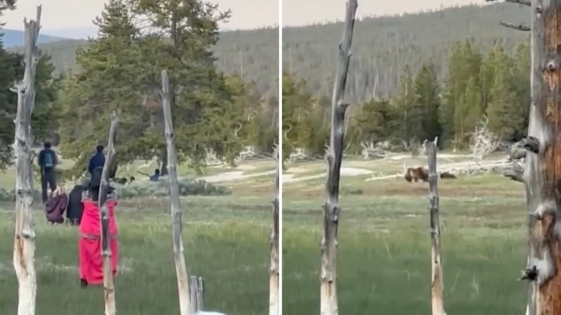 The Instagram account TouronsOfYellowstone (@touronsofyellowstone) shared a video of an adult grizzly bear and her cub that were spotted near the Fountain Paint Pots at Yellowstone.