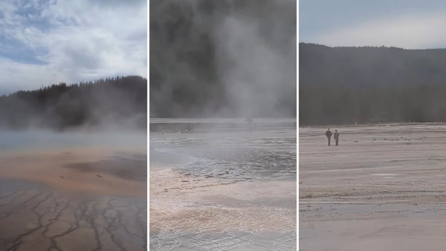 The clip was captured by Kamie Porro (@tx88k) and showed three people, including two children, walking on the fragile crust of Grand Prismatic Spring.